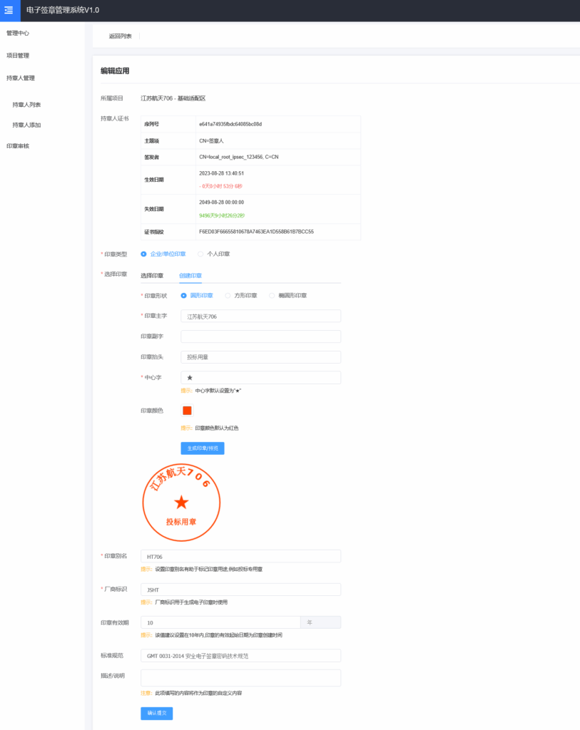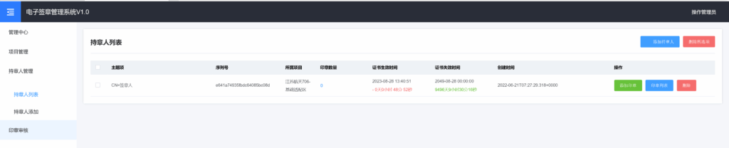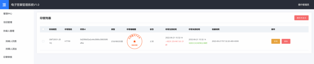 - 電子印章管理:支持創(chuàng)建、審核、凍結(jié)、解凍、廢除、恢復(fù)、更新等生命周期管理